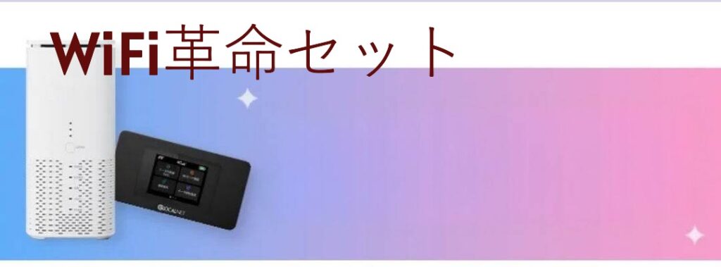 | WiFi革命セット | ホームルーターとモバイルWiFiの2台を1契約で利用可能。 | 家でも外でもギガを気にせずインターネットが楽しめる。 | 自宅だけでなく外出先でもWiFiを使いたいアクティブな方。 | 公式サイト |